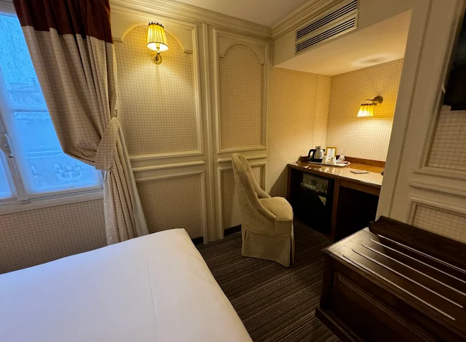 The rooms, simple yet elegant, are equipped with free Wi-Fi, a coffee maker, and provide a soothing environment ideal for relaxing after a day of sightseeing or business. The tea lounge overlooking a charming inner garden offers a moment of calm and relaxation. The bar with terrace is the perfect spot to enjoy an evening drink, soaking up a friendly atmosphere and the quintessential Parisian way of life.