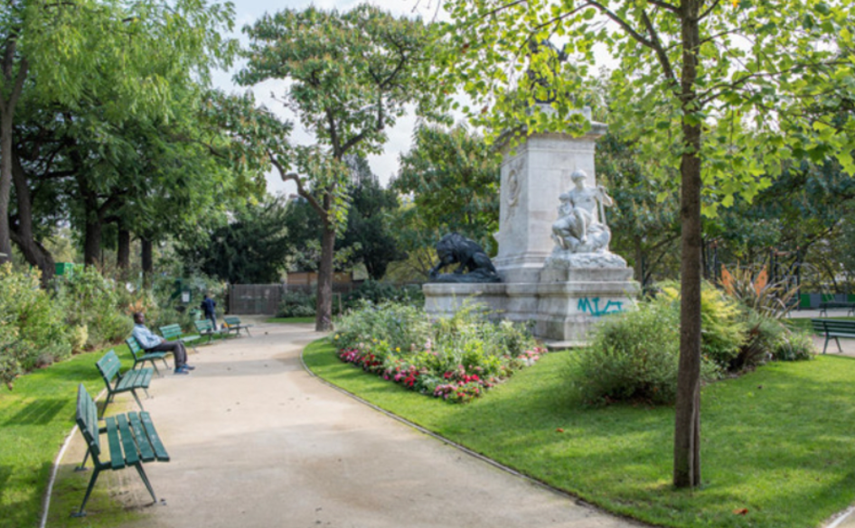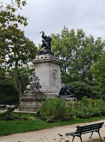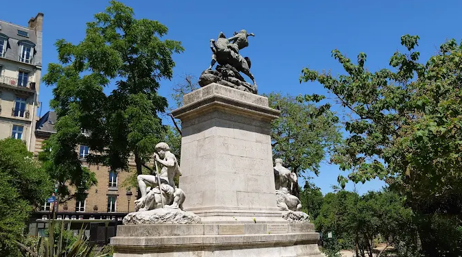 Dominating the square stands the Monument to Antoine‑Louis Barye, erected in 1894 following a design by Louis Bernier and sculpted by Laurent Marqueste, honoring the renowned animal sculptor born in Paris in 1795. The monument, built on its original stone pedestal and bronze decor, initially featured “Theseus Slaying the Centaur Bienor” and “Lion and Serpent.” These bronzes were melted down during the German occupation in 1942, but thanks to generous donors they were recreated and reinstalled in 2011 and 2014.