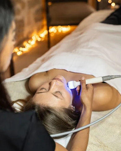 Upon arrival, guests enjoy a welcoming gesture—tea or herbal infusion—in a cozy waiting area with a fireplace. The décor is warm and natural, designed to promote relaxation and wellness.
