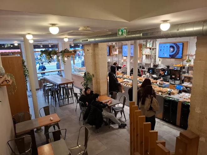 The spacious 240 m² premises feature a bright, modern décor and offer seating for around thirty guests, who can watch bakers shaping loaves from their tables. It’s perfect for breakfast, a mid‑day snack or a light lunch.