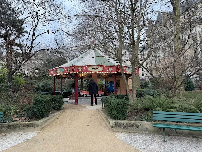 Families favor the play areas: two sandpits, spring toys, slides for toddlers and older kids, plus a colorful carousel on soft safety flooring. A small refreshment kiosk is on-site. The atmosphere is restful and shaded—ideal for lounging, reading or picnics—and serves as a green shortcut through busy streets.