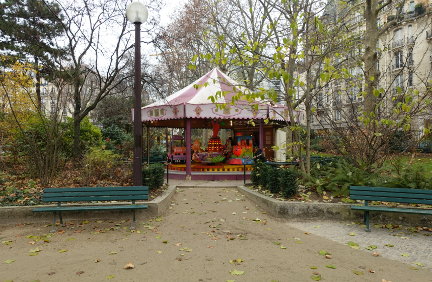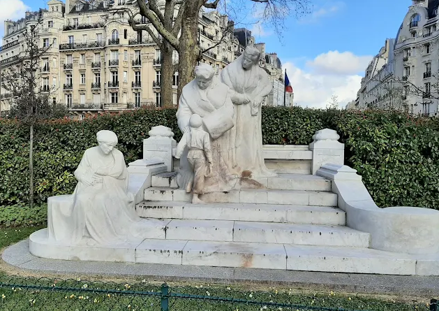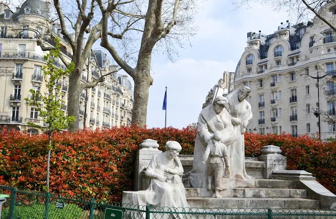 The central path, “Pierre-Herbart Alley,” honors the nearby resident writer and Second World War resistance fighter. At its center stands an elegant 1914 white marble sculpture by Paul Moreau‑Vauthier, depicting philanthropists Marguerite Boucicaut and Baroness Clara de Hirsch, reflecting the charitable spirit behind Le Bon Marché.