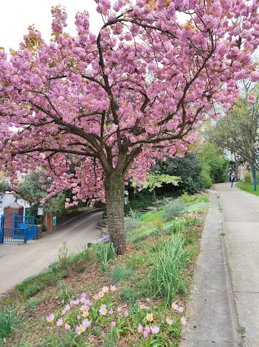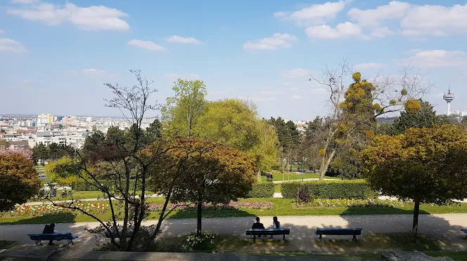 Three large sloping lawns offer wide panoramic views over eastern Paris—from Aubervilliers to Pantin and even Roissy’s runways on clear days. Included in the greenery are notable trees such as copper beech, ash, and a giant sequoia, providing shade and botanical interest.