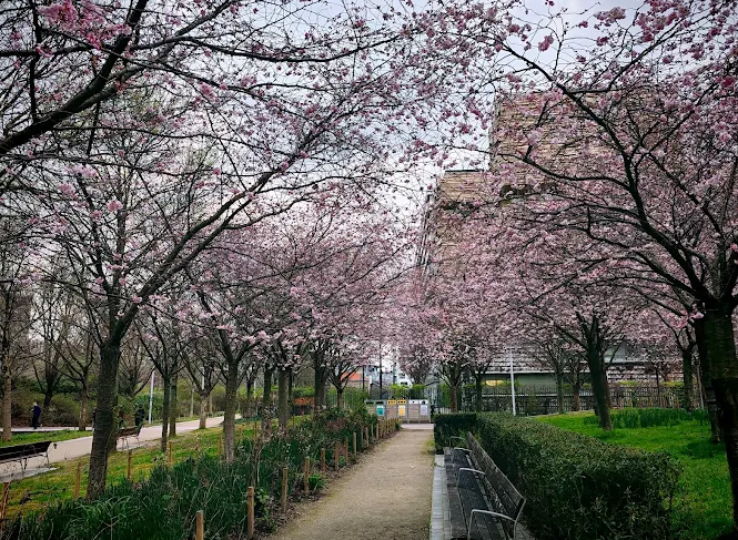 The park’s layout centers on three thematic axes — seasons, sport, and water. Planting reflects the seasons: cherry trees in spring, grasses and open lawns in summer, maple in autumn and evergreens in winter. The site retains traces of its rail past, with historical tracks built into pathways.
