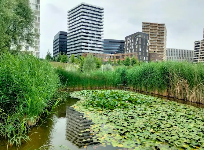 Amenities abound: children’s play areas, a skatepark, a multisport court (basketball, wall‑ball, pétanque), and ping‑pong tables. Rolling lawns are ideal for sunbathing, picnicking or reading outdoors. At the heart lies a nearly 3,000 m² biotope pond planted with irises, water lilies and reeds, serving natural water filtration and irrigation via rainwater collection — a hallmark of eco‑management.