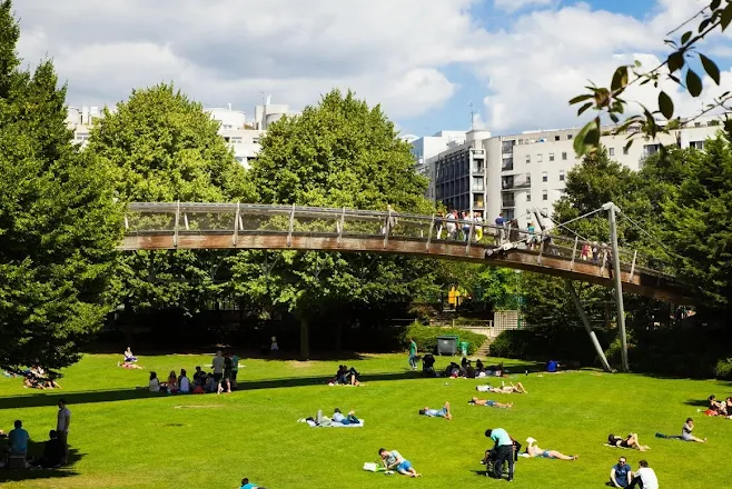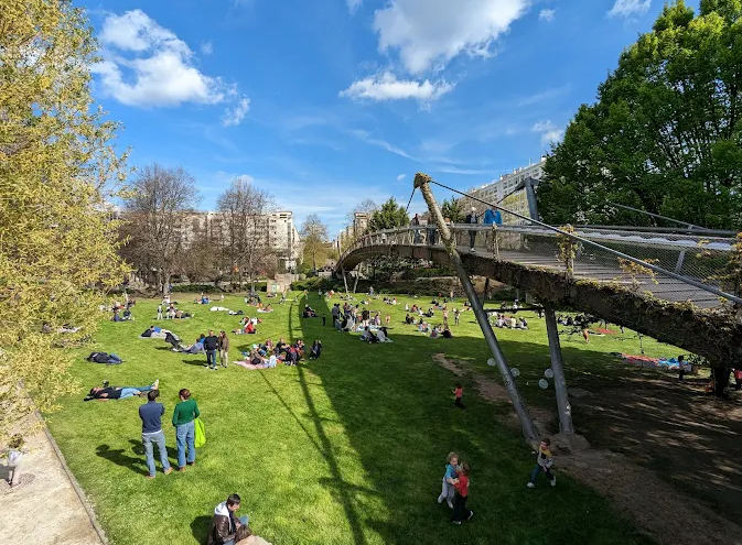 Further along, you’ll find the Vivaldi walkway, lush tunnels, a suspended bridge over Jardin de Reuilly, and tranquil green trenches. The route winds through the Hector‑Malot Garden, Gare‑de‑Reuilly Garden, and Square Charles‑Péguy, all featuring play areas, seating, and spots for rest. The lower section, open to cyclists, passes through dense plantings including lime trees, roses, bamboo, agapanthus and eucalyptus.