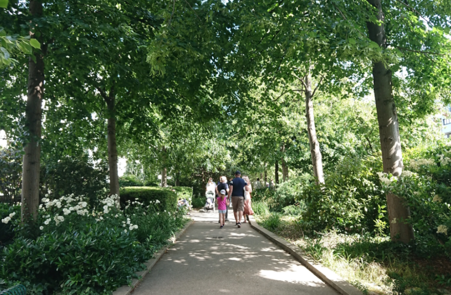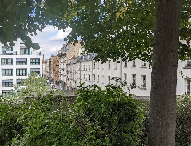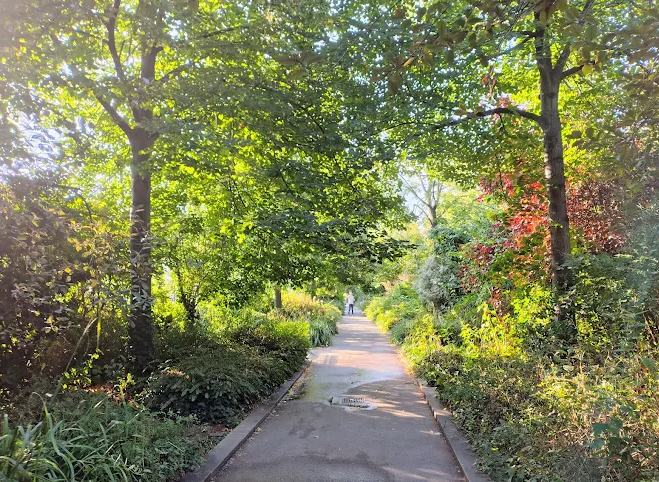 The ambiance shifts between refined urban spaces and wild greenery, with rooftop views, contemporary architecture, hidden sculptures, and street art diversions. It also serves as an ecological corridor for city wildlife (foxes, bats, hedgehogs).