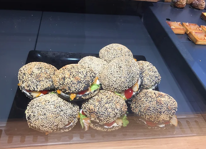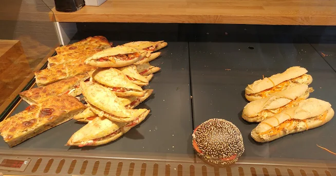 Savory offerings include sandwiches and meal sets: bagnat, baguettes with fillings, fougasses, quiches, vegetarian or chicken burgers, wrap, etc.—ideal for a gourmet lunch or snack. Available for on-site purchase, takeaway or online ordering for click‑and‑collect or delivery.