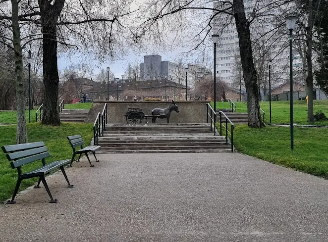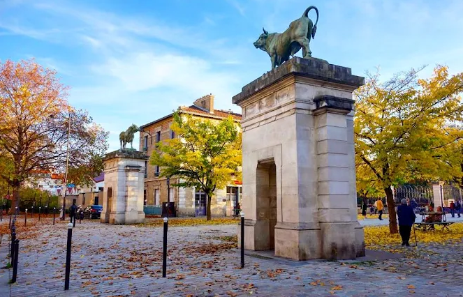 Remnants of the slaughterhouse era – including a horses’ market hall now hosting a weekend antique book market, clock tower, statues of bulls and butcher figures – evoke the site’s industrial heritage. Sculptures include a bust of Georges Brassens by André Greck, a bust of Dr. Émile Decroix, a horse head, plus ‘The Donkey’ (Lalanne) and ‘The Bulls’ (Bonheur). There’s also a small Pinot Noir vineyard, the “Clos des Morillons,” with volunteer harvests and wine auctions benefiting local charities. An educational apiary engages kids and adults, hosting an annual Honey Festival in October.