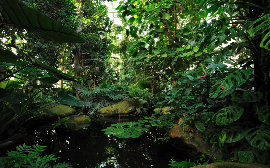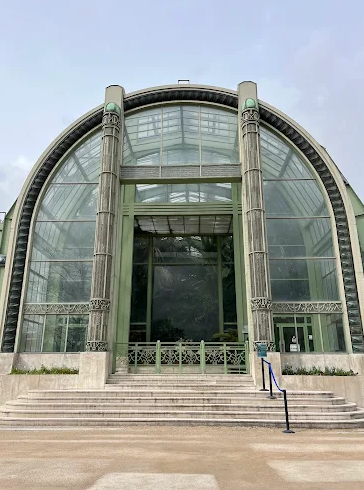The Art Deco entrance, created by René Berger in 1937, leads into the “Humid Tropical Forest Greenhouse.” Spanning 750 m², it's filled with lianas, banana plants, orchids, and ferns. A 15‑m artificial rock with a waterfall and cave crowns the greenhouse, creating a true sensory escape with tropical warmth and water sounds.