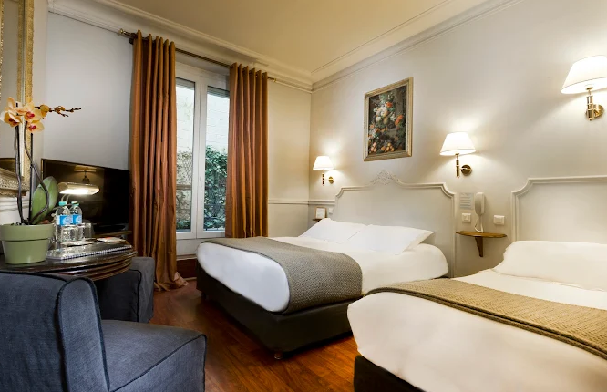 With 42 rooms—from standard singles to exclusive triples—the hotel offers a warm, intimate ambiance blending wood flooring, moldings, antique furnishings, and plush linens—all with an eco-friendly twist. Air-conditioned, soundproofed rooms feature free wifi, tea/coffee facilities, satellite TV, DVD/Blu-Ray player, minibar, safe, hairdryer, and organic toiletries . The cozy lounge hosts a homemade breakfast buffet from 7 to 10 am with fresh juice, organic pastries, gluten-free and vegan options .