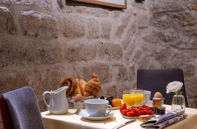 Breakfast is served under stone‑arched ceilings, featuring pastries, French cheeses and hot drinks (approx. €14), with in‑room service also available. Rooms include private bathrooms (bathtub or shower), hair dryer, toiletries and air‑conditioning. Double glazing and soundproofing ensure a peaceful night’s sleep.