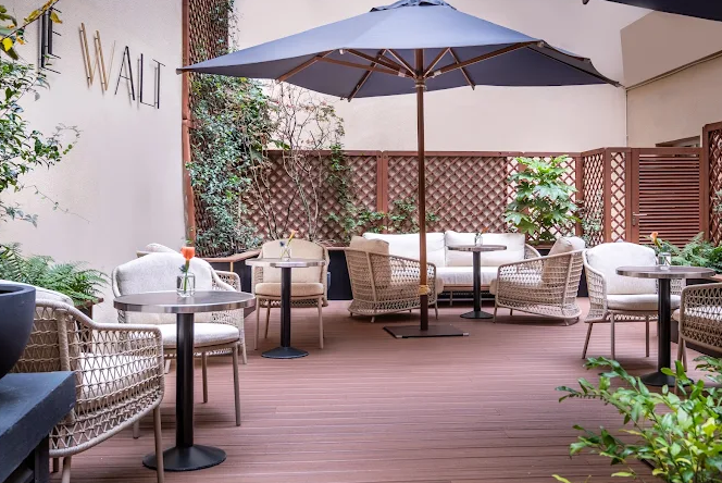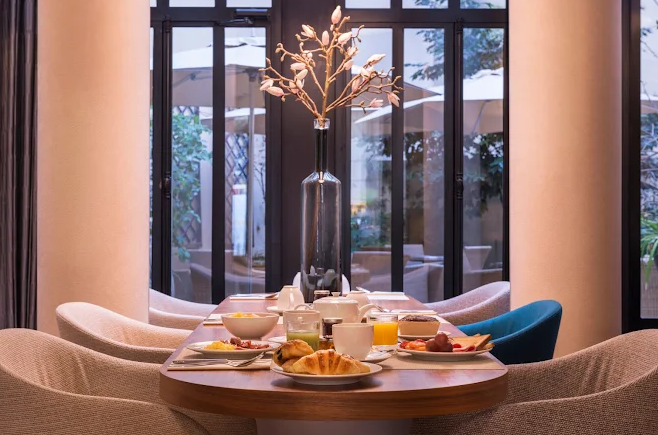 The highlight of any stay is the charming internal garden and patio–a peaceful hub for sipping the colorful buffet breakfast, enjoying an aperitif, or simply relaxing in the city’s heart . The bar, with its natural tones and elegant materials, invites moments of calm between sightseeing.