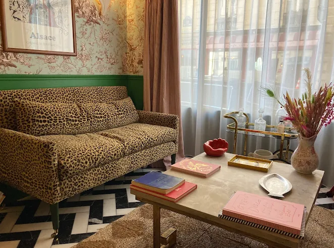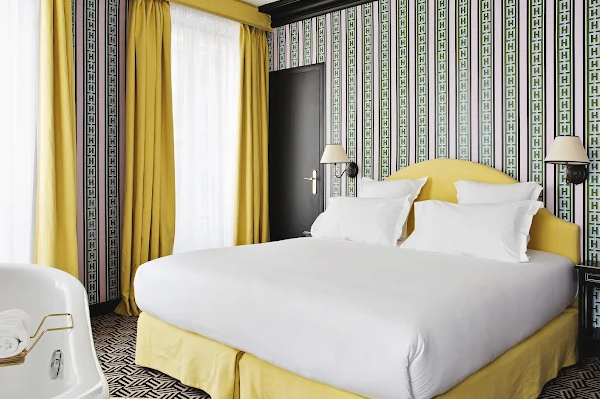 Hotel Les Deux Gares, located at 2 rue des Deux Gares, blends contemporary boldness with Parisian chic. Launched in 2020 by the Touriste group (founded by Adrien Gloaguen), it marks the first hotel designed by British designer Luke Edward Hall. Across six floors, 40 unique rooms embrace a retro‑Art Deco aesthetic: emerald‑green walls, floral wallpapers, black‑and‑white chevron floors, leopard or gilded furniture, and nods to Cocteau, Warhol, or Hockney. The effect is visually stunning, exuberant yet never tacky.