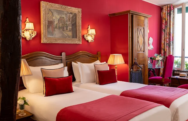 Hotel des Marronniers, at 21 Rue Jacob, captures the hushed elegance of Saint‑Germain‑des‑Prés. Set in a historic building, it offers 36 individually styled rooms (Classic, Superior Garden, Comfort, Deluxe, Family), each featuring free Wi‑Fi, air conditioning, TV, safe, and private bathrooms with shower or bath. Many rooms overlook a peaceful courtyard or lush garden, a hidden oasis in the heart of Paris . Check‑in begins at 3 PM (check‑out by noon), and the multilingual staff are always on hand to enhance your stay. Each morning from 7 AM to 11 AM, enjoy a generous buffet breakfast in the garden, veranda or vaulted lounge: pastries, bread from the nearby bakery, scrambled eggs, bacon, cheese, fruits, yogurt… All for approximately €17 per adult (children under 12 €9).