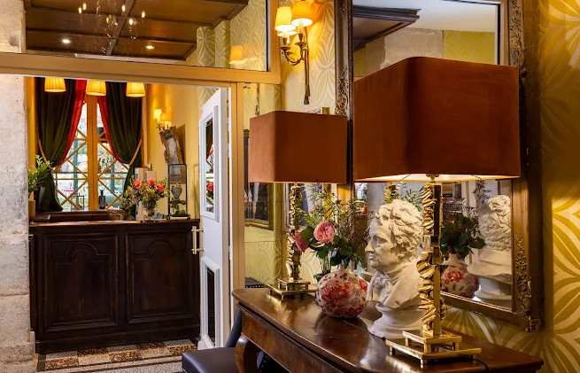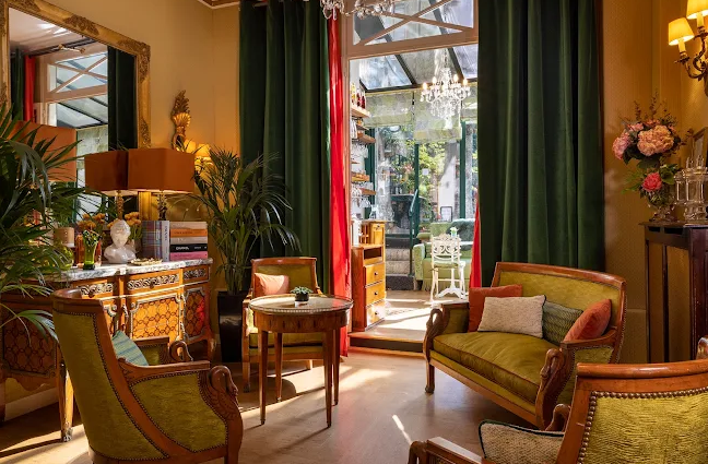The ambiance blends Parisian elegance—wood furnishings, floral fabrics, stone‑walled lounge—with intimate charm, accentuated by garden greenery and soft lighting. Guests often enjoy tea or an evening drink under the chestnut tree .