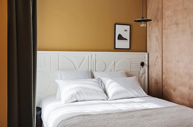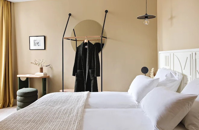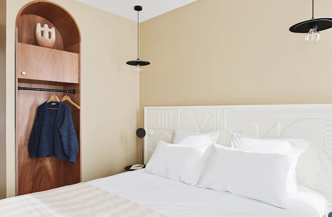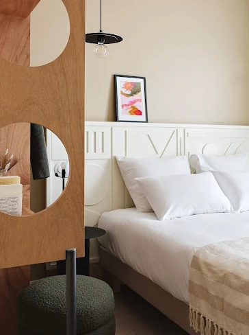 Since its 2012 opening, the hotel offers 44 cocoon‑like rooms with earthen tones, Okoumé wood, plush mattresses, delicate linens and some with balconies overlooking Paris rooftops. Room categories include Classic Single, Classic Double/Twin (including two accessible rooms), and Double/Twin Superior, which feature private terraces, Nespresso machines, large flat screens, king/twin beds, and shower or bath options.