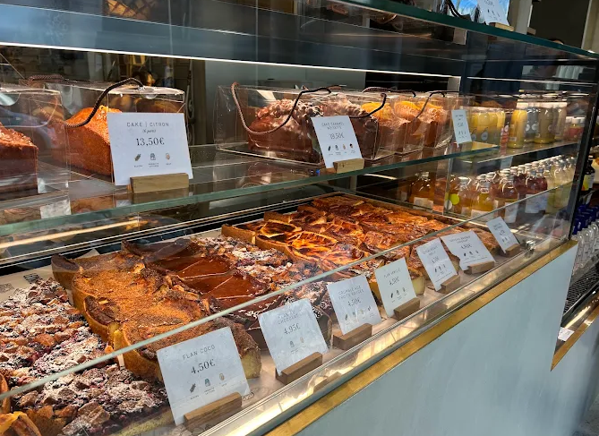 The shop also features a cozy tasting area with indoor seating and a small terrace. A coffee corner, in partnership with L’Arbre à Café, serves top‑quality espresso, flat whites, matcha lattes and iced coffees via a premium Marzocco machine.