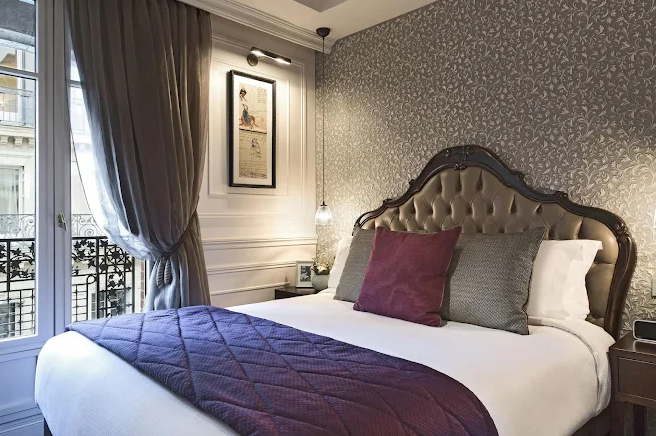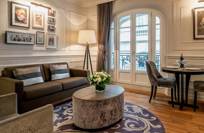 Each suite, from Junior to Royal, offers a bright living area with a fully equipped kitchenette (fridge, microwave, dishwasher, kettle), a lounge space with a flat-screen TV, and a separate sleeping area. Some even feature a balcony with classic Parisian rooftops views . Free Wi‑Fi, premium linens, bathrobes and slippers, and daily housekeeping complete the refined offering.