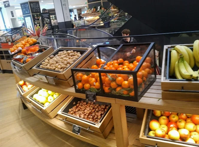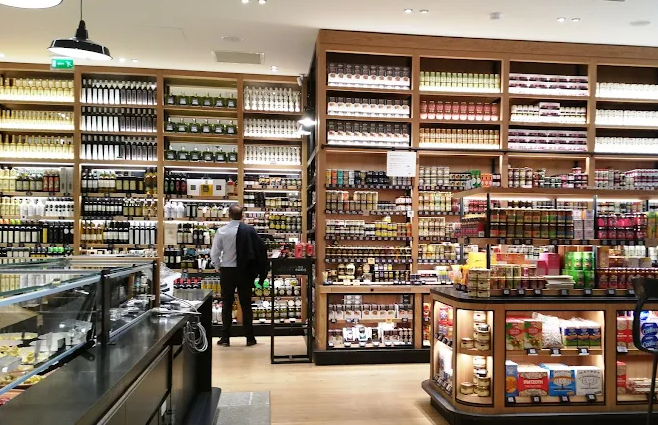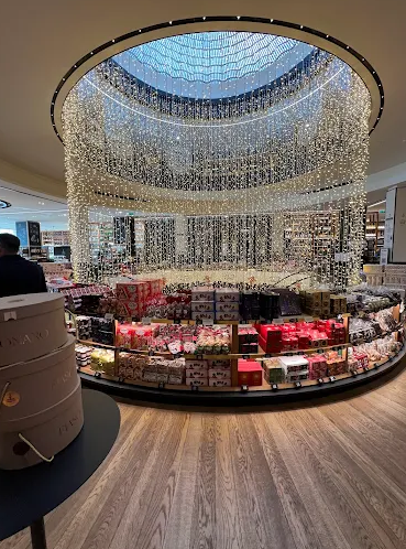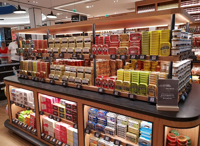 Spread over approximately 2,800 sqm across four floors, it offers more than 30,000 product references. Its gourmet grocery section alone includes around 6,000 items such as 100 types of chips, 350 varieties of jams, 350 chocolate bars, 200 beers and 150 bottled water selections from around the world. Beneath the restored dome, visitors explore counters for fish, meat, bakery and pastries, along with tasting counters for luxury goods, world cuisine, tea‑coffee and Iberian delights.