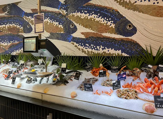 The atmosphere seamlessly blends elegance with artisanal craftsmanship: from Mathilde Jonquière’s mosaic artwork, to oak vats holding large volumes of wine, to finely crafted copper and stone, all connected by sweeping open aisles and escalators. Each department acts as a living tableau: visible meat maturation, live preparation benches and a 4,000‑liter oak wine barrel in the cellar create a theatrical shopping experience.