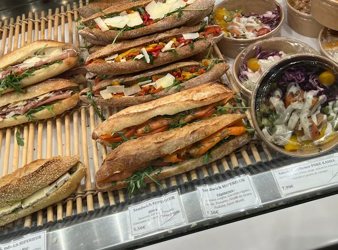 Here in the 6th arrondissement you’ll find a wide selection: classic baguettes, specialty breads, flaky viennoiseries like croissants and pains au chocolat, cookies, cupcakes and daily pastries. They also offer fresh sandwiches and salads to go, made with top‑quality ingredients.