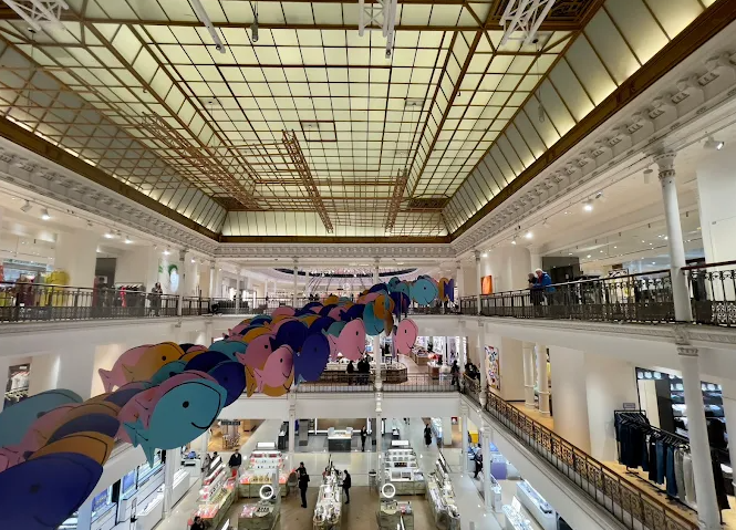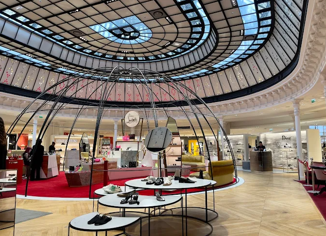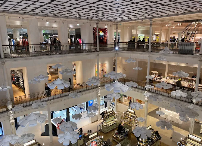 Today the 30,000 m² retail space features creators’ fashion, beauty, art of living, and gourmet food. Upon arrival, visitors are greeted by refined leather goods, jewelry, watches and accessories. The Beauty space under the Art Deco glass roof presents exclusive brands and a high‑end beauty institute. Women’s, men’s, children’s fashion spreads through multiple levels, while the bookstore and winter garden house luxury footwear and literature enthusiasts.