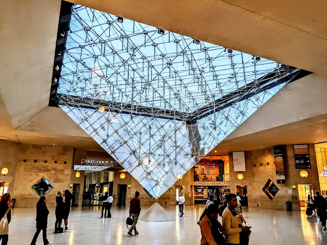 Part of the Grand Louvre project (1981–1989), its primary function was to centralize museum access in the underground Hall Napoléon, with direct routes to the Sully, Richelieu, and Denon wings. This hall houses ticket booths, an auditorium, shops, cafés, and connects to the Carrousel du Louvre underground mall and Palais‑Royal metro station.