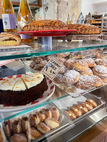 Their product range includes sourdough loaves (Mamiche miche, muesli, campagne), flaky croissants, Valrhona pain au chocolat, vanilla or chocolate‑filled doughnuts, melt‑in‑your‑mouth cookies, and the signature orange‑blossom & chocolate babka. Savory items like pesto fougasse, ham‑cheese rolls, baguette or brioche sandwiches and Lomi coffee complete the offering.