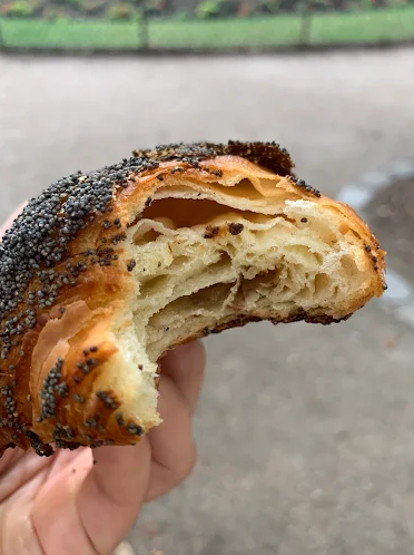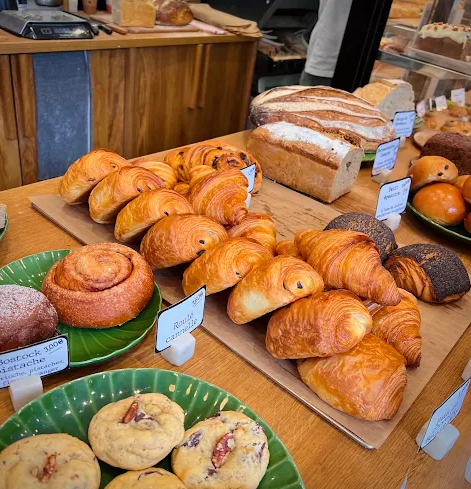 Every product is made in-house. Expect a classic baguette at €1.20, a seeded Danish‑style loaf with low glycemic index, cinnamon or cardamom rolls, the creative croissant cake (rebaked croissant trimmings), apple turnovers, cookies, cream puffs and chocolate‑buckwheat tarts (up to €5) — all carefully crafted to prioritize flavor and freshness over quantity.