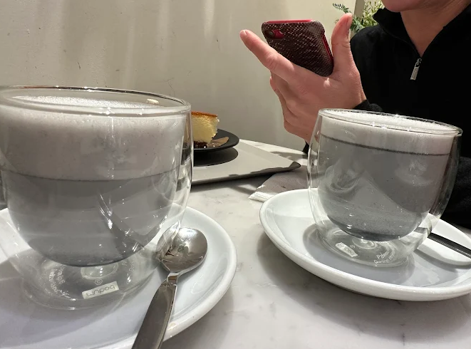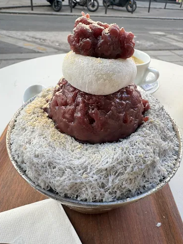 In summer, hearty Korean bingsu desserts in black sesame, matcha, or red bean versions are served in stainless bowls, costing €8.5 to €15 depending on toppings.