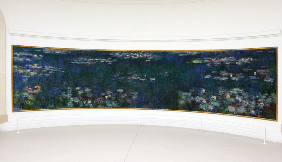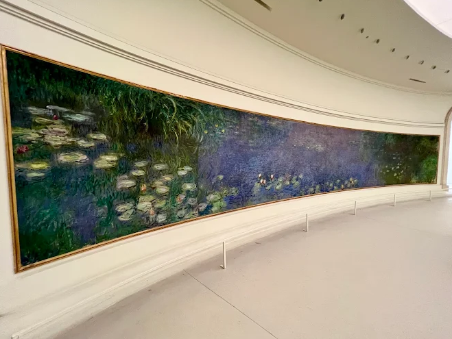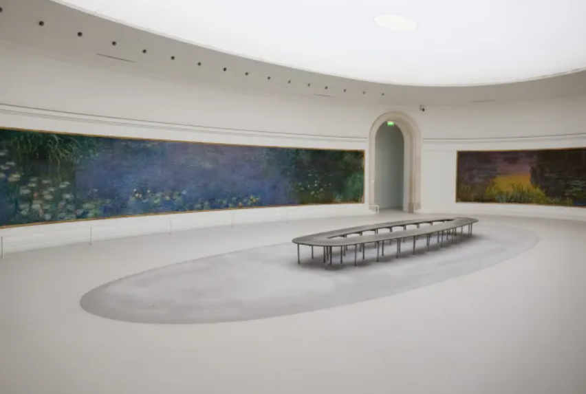 The museum’s two vast oval rooms, flooded with zenithal natural light, create a panoramic experience immersing visitors in calming hues: blues, greens, and subtle pinks seem to shimmer around you. One room evokes dawn, the other a more introspective dusk-like ambience.