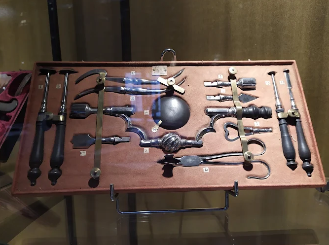 The exhibit takes place in a stunning 1905 hall, preserved almost intact, with a luminous skylight and original wood paneling. One can marvel at ancient surgical tools, anatomical models, mannequins, and doctor’s kits used by those who treated Louis XV or served at Waterloo. Highlights include over 500-year-old trepanning tools, curved amputation knives, bullet forceps, a 16th-century prosthetic hand, 18th-century porcelain dentures, and the first portable electrocardiograph.