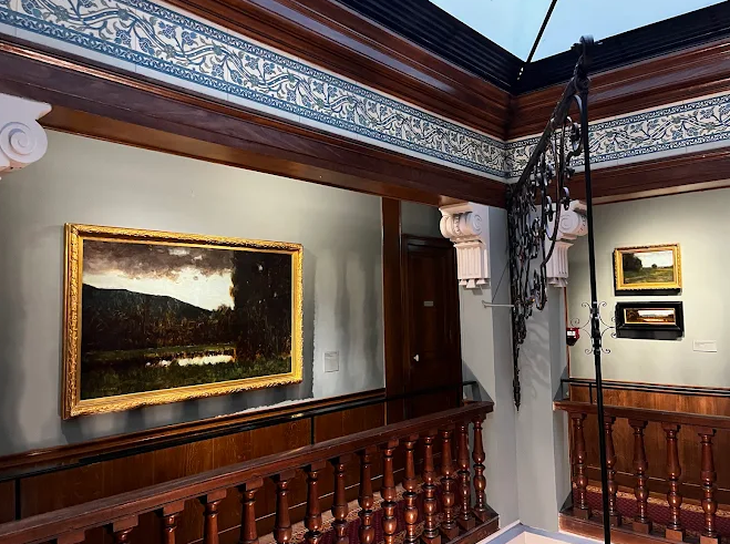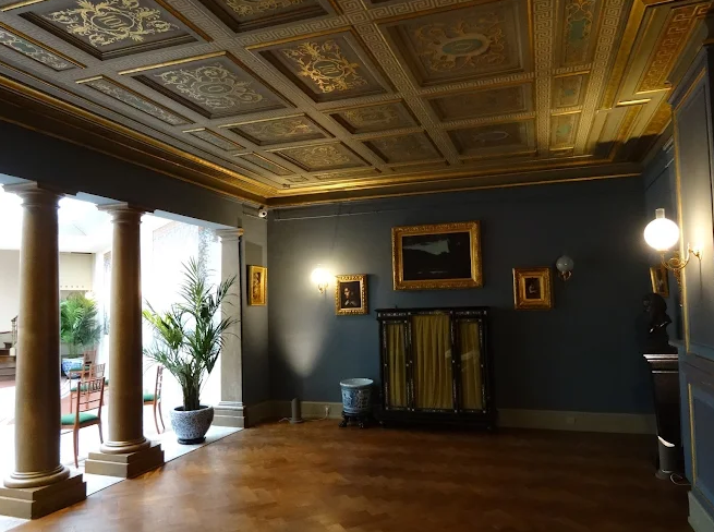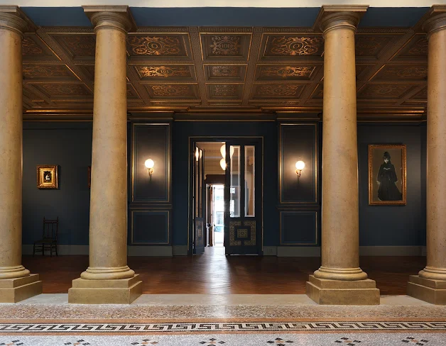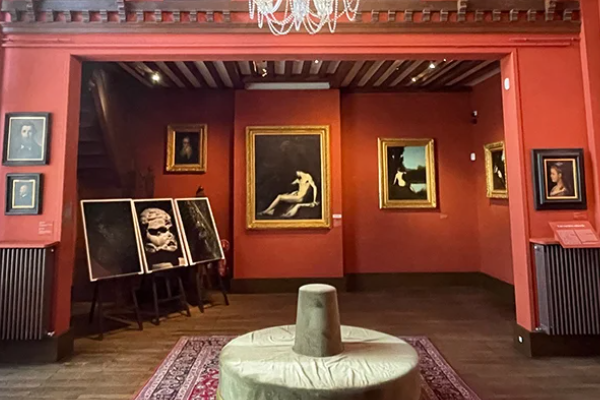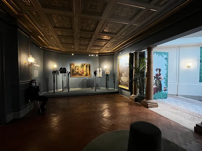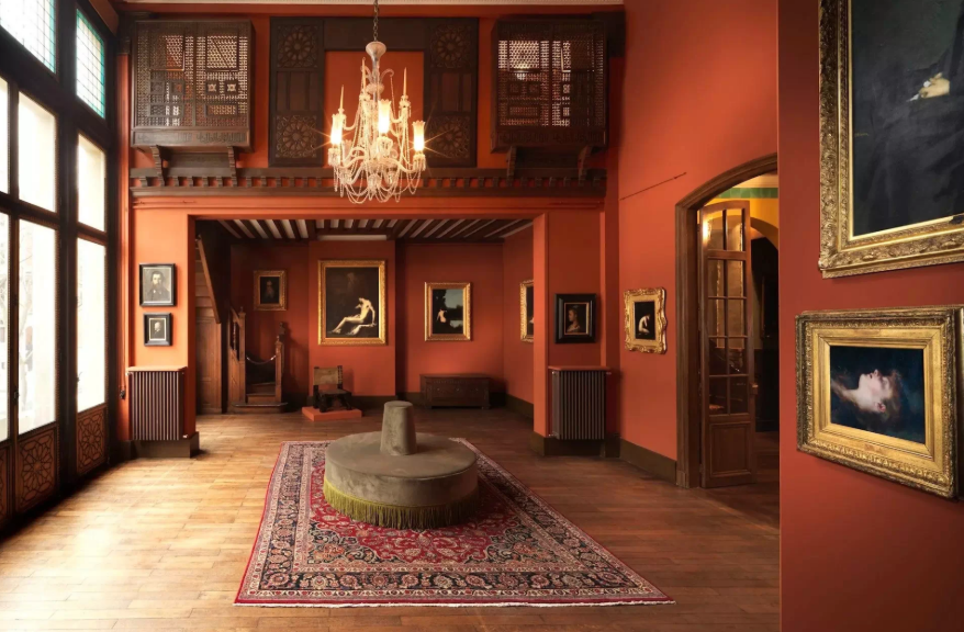 Housed in the former studio‑home of painter Guillaume Dubufe, the space combines a neo‑Renaissance columned salon, a luminous winter garden, and a majestic staircase. The three‑level layout unfolds around two themes: his official art career and the working studio, including the red studio, grey studio, moucharabieh partitions, sketches, furniture and personal items—creating a hushed, immersive atmosphere.