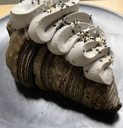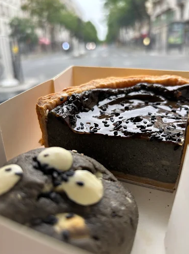 Unique features include an annual €1 black sesame croissant day, and creative treats like matcha‑mochi cookies, carrot cake, black sesame flan, and egg‑tarts in matcha or vanilla.