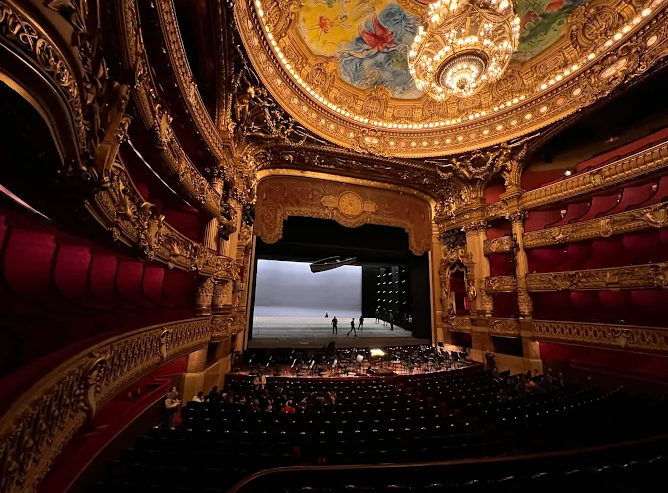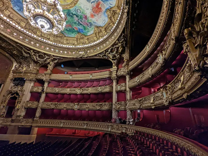 The horseshoe‑shaped auditorium accommodates nearly 1,900 spectators over five levels; its ceiling, restored by Marc Chagall in 1964, bursts with contemporary colours set against a classic backdrop. Behind the gilding, the library‑museum preserves sets, models and archives tracing three centuries of lyric history.