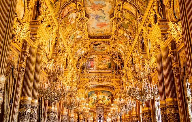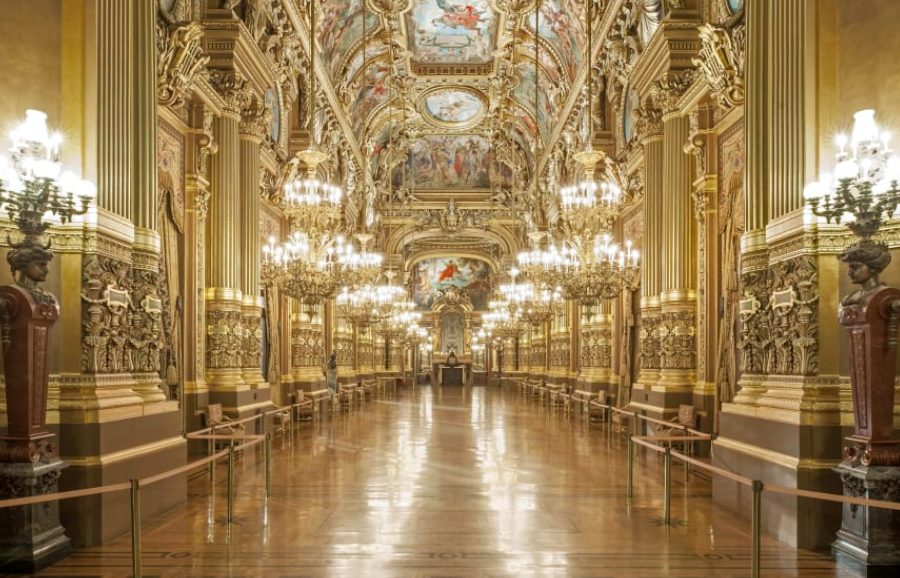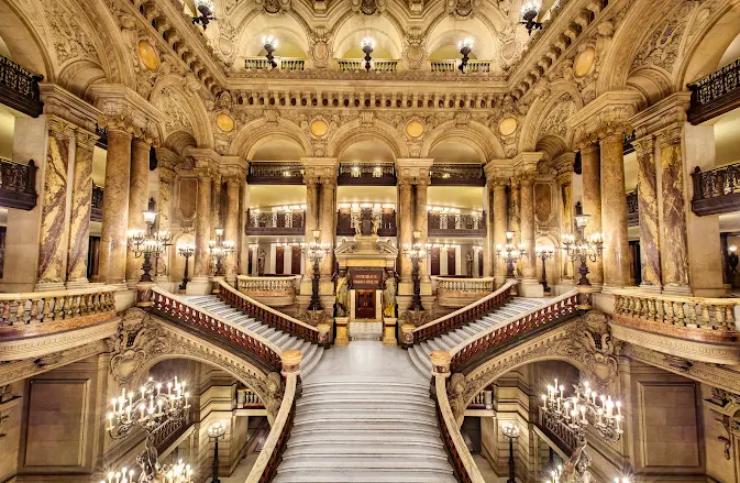 The eclectic architecture blends polychrome marble façades and gilded statues, while the interior’s refined opulence is revealed in the grand marble staircase, with its elegant balustrades and statues of Tragedy and Comedy. The Grand Foyer, evoking Versailles’ Hall of Mirrors, opens onto the Avenue de l’Opéra .