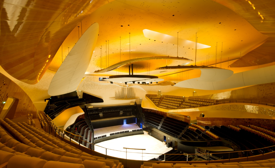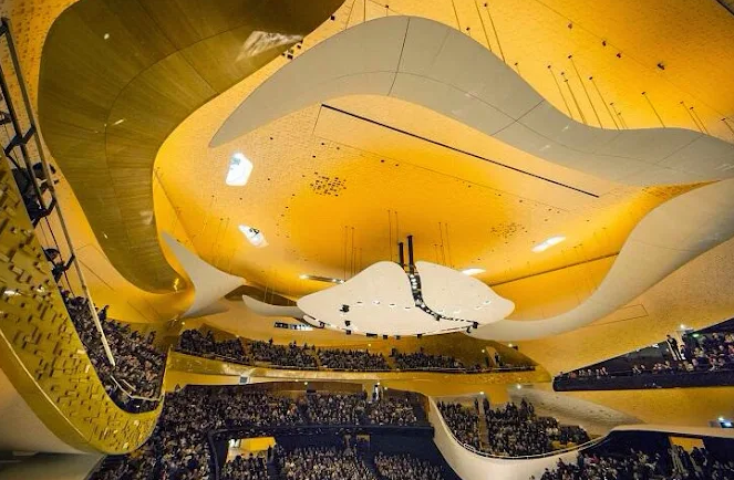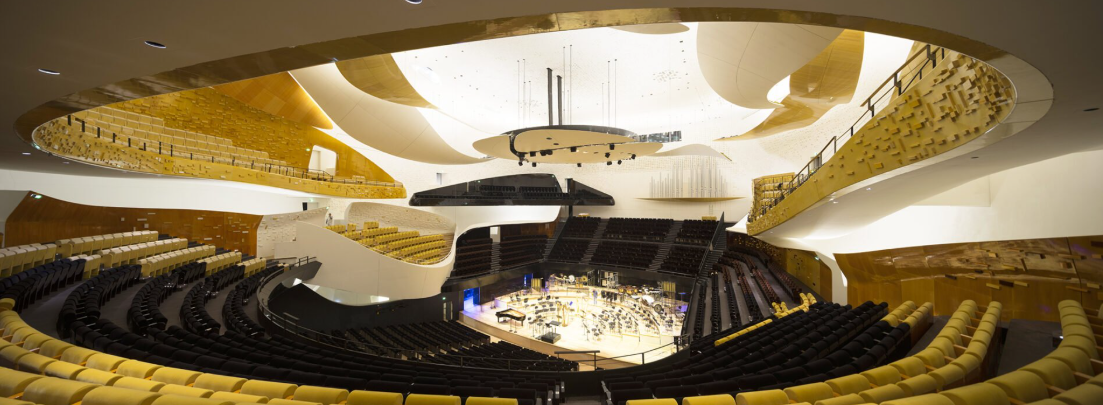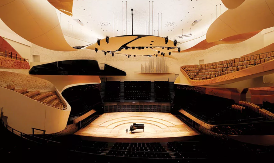 The Pierre Boulez Great Hall, shaped in a vine-style auditorium, seats up to 2,400 people, with a maximum 32‑meter distance between the conductor and the audience, creating an intimate acoustic and visual experience. Suspended wooden “clouds”, floating balconies and carefully selected materials ensure a warm, precise and consistent acoustic environment throughout.