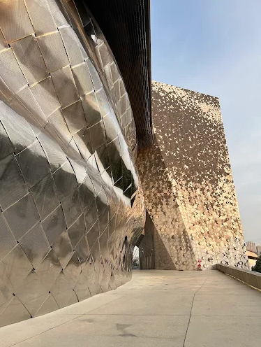 The striking exterior features overlapping aluminium shingles evoking a hill or flock of birds, with a height of 52 m. The site spans some 79,000 m² encompassing concert, exhibition, rehearsal, educational and leisure spaces.