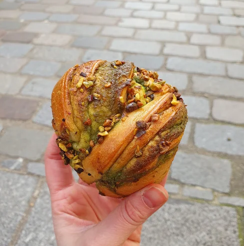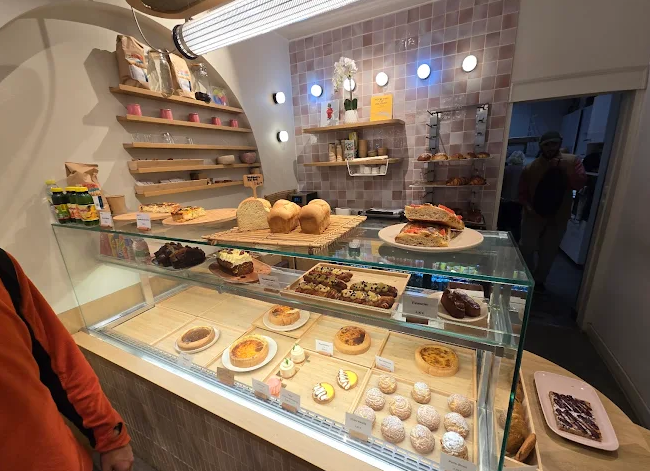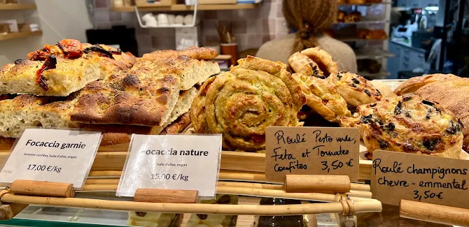 Everything here is organic and handcrafted: signature sourdough “polka” breads (plain, fig‑walnut, cranberry, or zaatar), rye tourte, corn, turmeric‑pumpkin seed loaves, and soft shokupan milk bread. Their zaatar polka bread is particularly notable (around €10.89/kg).