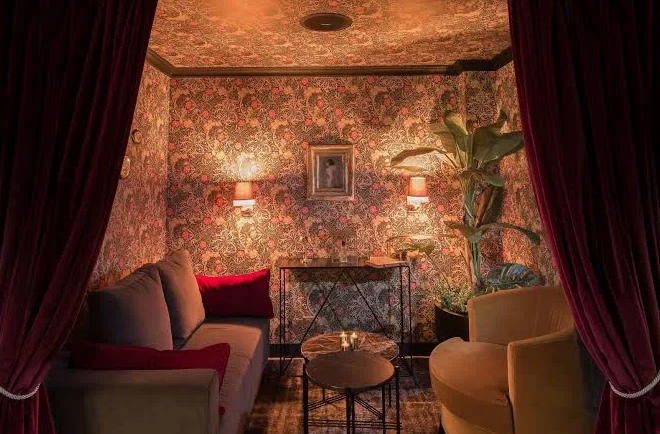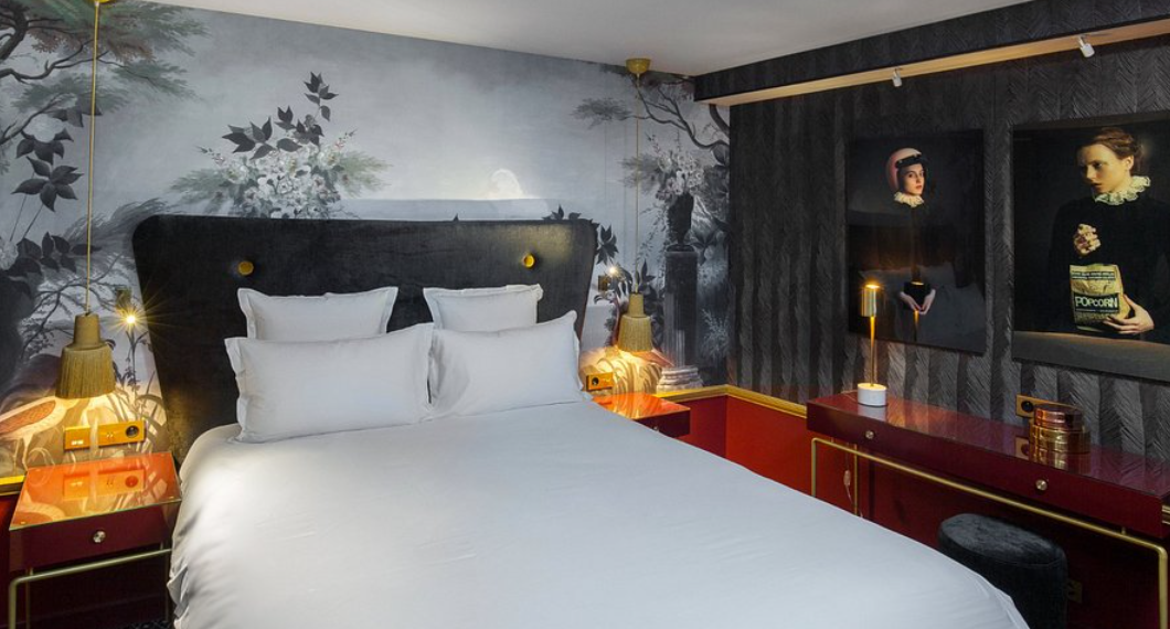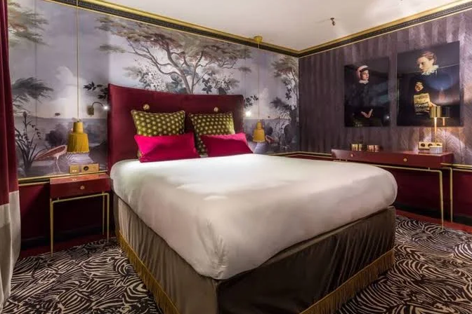 SNOB Hotel, located at 84–86 rue Saint‑Denis in Paris’s 1st arrondissement, is a four‑star boutique celebrating “the Parisienne” in a décor that is both bourgeois and contemporary. Designed by Dorothée Delaye and Daphné Desjeux, it features 24 refined rooms adorned with velvet, houndstooth patterns, and Renaissance-inspired portraits in shades of onyx, burgundy, and gold.
