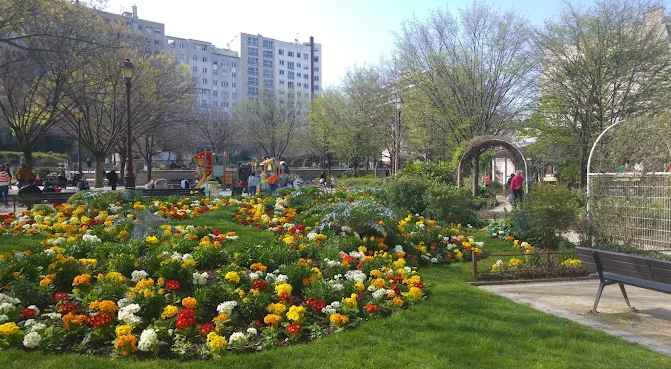 A peaceful green haven in Montmartre with games, waterfalls and memorial.