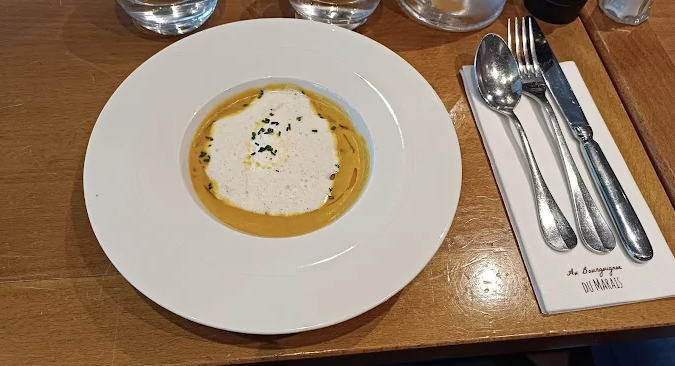 The menu showcases traditional Burgundian cuisine. Starters include renowned Burgundy snails (6 pieces – €12) and homemade parsley ham terrine (€13). Main courses highlight the signature beef bourguignon with small potatoes, bacon and mushrooms (€26), and other dishes such as veal kidneys with violet mustard, or duck breast with blueberry sauce (€30). The wine list is purely Burgundian, offering prestigious bottles like Puligny‑Montrachet Premier Cru (€69) or glasses of Hautes‑Côtes de Nuits (~€9).