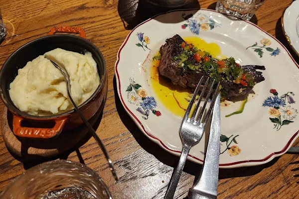 The menu pays tribute to classic French cuisine: a richly filled Richelieu pâté en croûte, melt‑in‑your‑mouth beef bourguignon served in its cast‑iron cocotte, Simmental beef onglet with creamy mashed potatoes, along with staples such as duck magret, veal kidneys, and supreme chicken with morels. Daily specials add surprises—pan‑fried razor clams with fresh garlic, or burrata ravioli from Puglia.