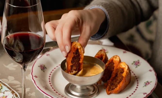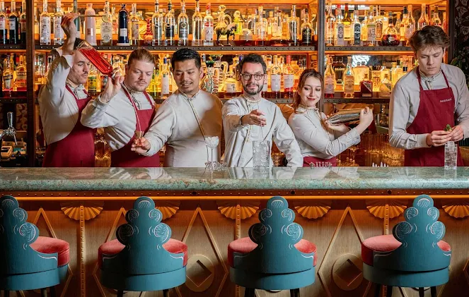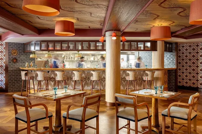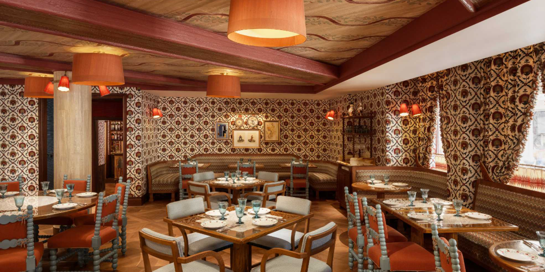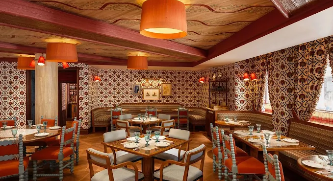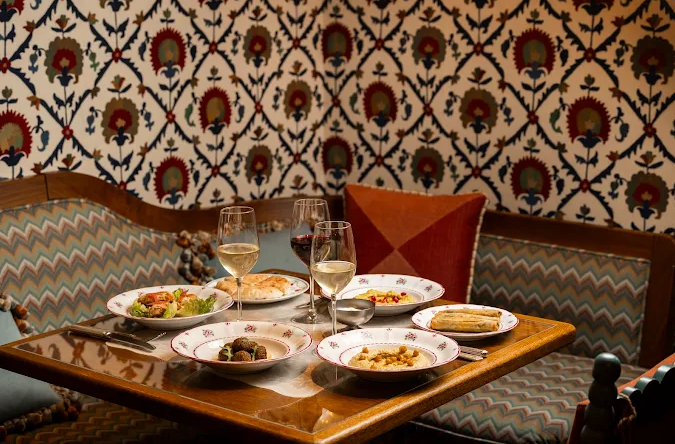 The ambiance, designed by Martin Brudnizki, channels a plush Eastern European country house. Painted frescoed walls, lush velvet seating, heavy drapes, intimate banquettes, and an open kitchen create a warm, bustling atmosphere punctuated by cheerful “Yes, chef!” exclamations.