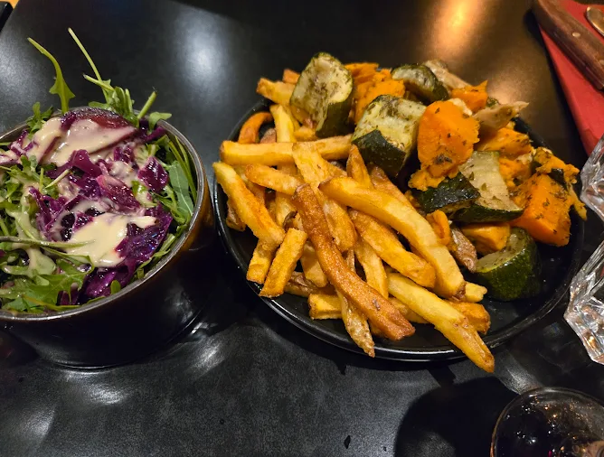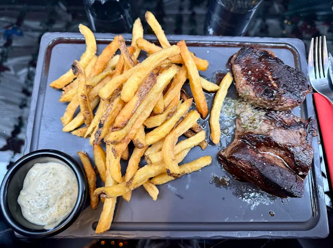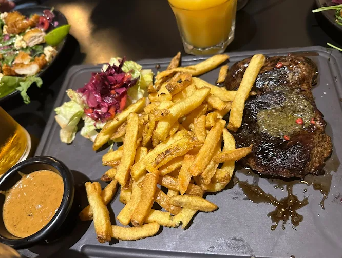 The highlight is the meat. Under Chef Daniel Renaudie’s guidance, the cuts—Argentine rib-eye, flank steak, 1 kg bone‑in rib or lamb rumsteak—are dry‑aged at least 30 days to ensure unrivalled tenderness and flavor. The meats are sourced weekly from France, Argentina or Ireland . Sauces are homemade, and vegetables and eggs come from Ruben Sarfati’s organic farm near Provins.