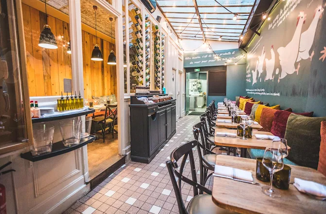 The moment you step inside, the décor simultaneously surprises and delights: duck‑blue walls, whimsical rooster figurines, a glass ceiling, and a classic zinc bar create a relaxed atmosphere . The vibe strikes a balance between lively and cozy, perfect for couples, families, friends, and even business lunches .