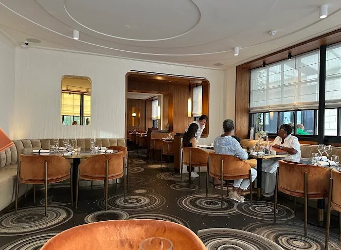 The décor by Didier Benderli blends geometric mirrors, velvet banquettes, and Art Deco woodwork, creating an atmosphere that’s both sophisticated and inviting — perfect for business lunches or romantic dinners.