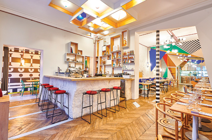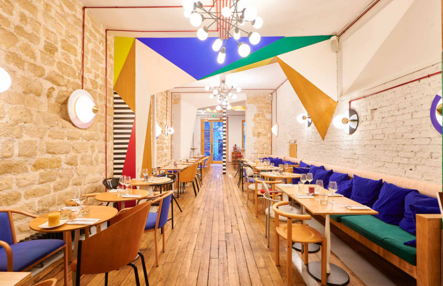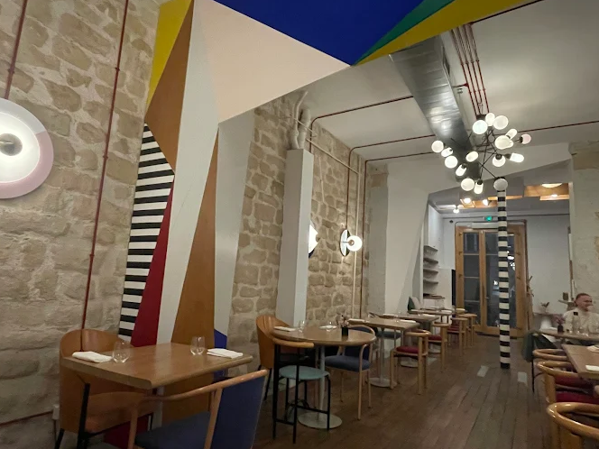 The playful ‘60s pop décor by Charles du Pouget combines exposed brick, striped columns, and geometric motifs, creating a warm yet stylish atmosphere lefooding.com . Spacious and bright, the dining room ensures comfort and conviviality.
