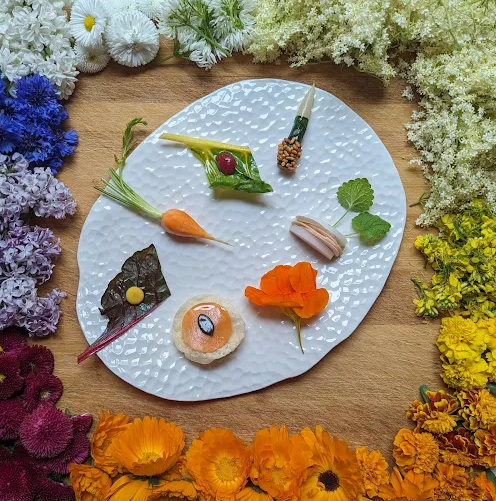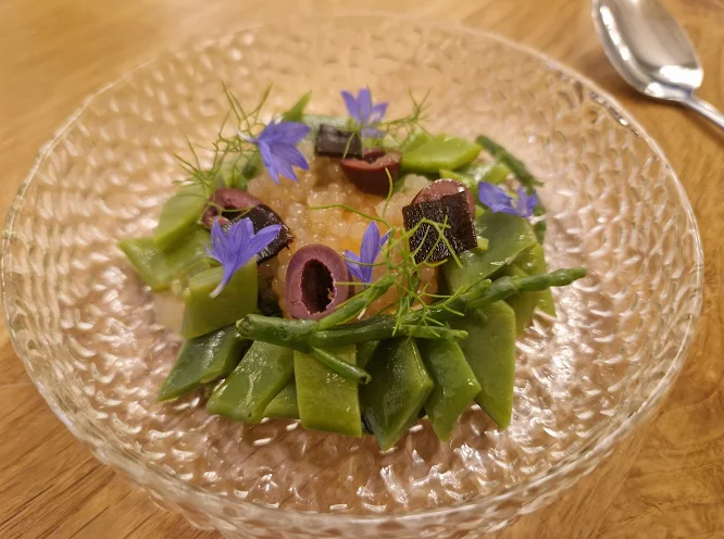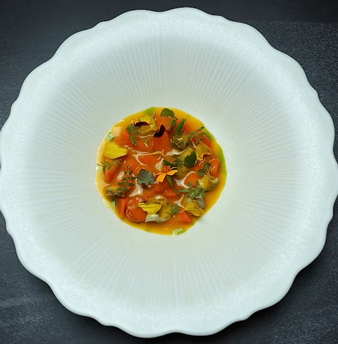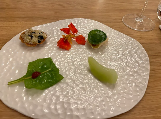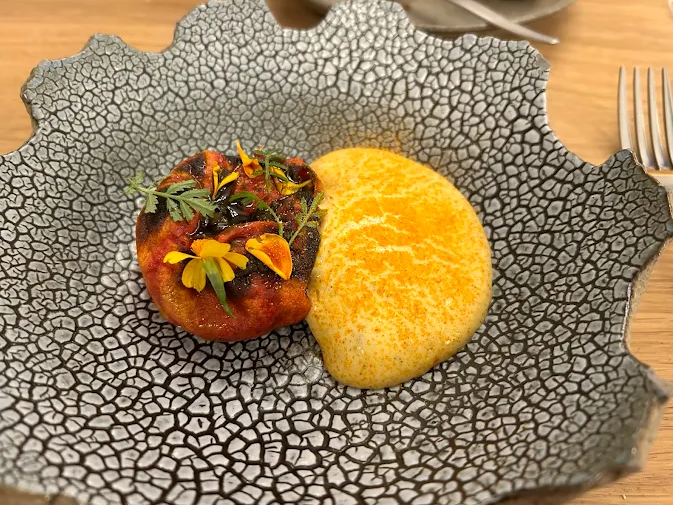 Culinary creations are artfully presented, with surprising combinations: zucchini flowers with Taggiasca olives and black garlic; tuna with black sesame and white chocolate; cod in dashi kombu broth; pork with tandoori-spiced jus. Fermented fruits, creative pickles, exotic herbs, and inventive condiments showcase a seasonal, low-waste, mostly organic philosophy.